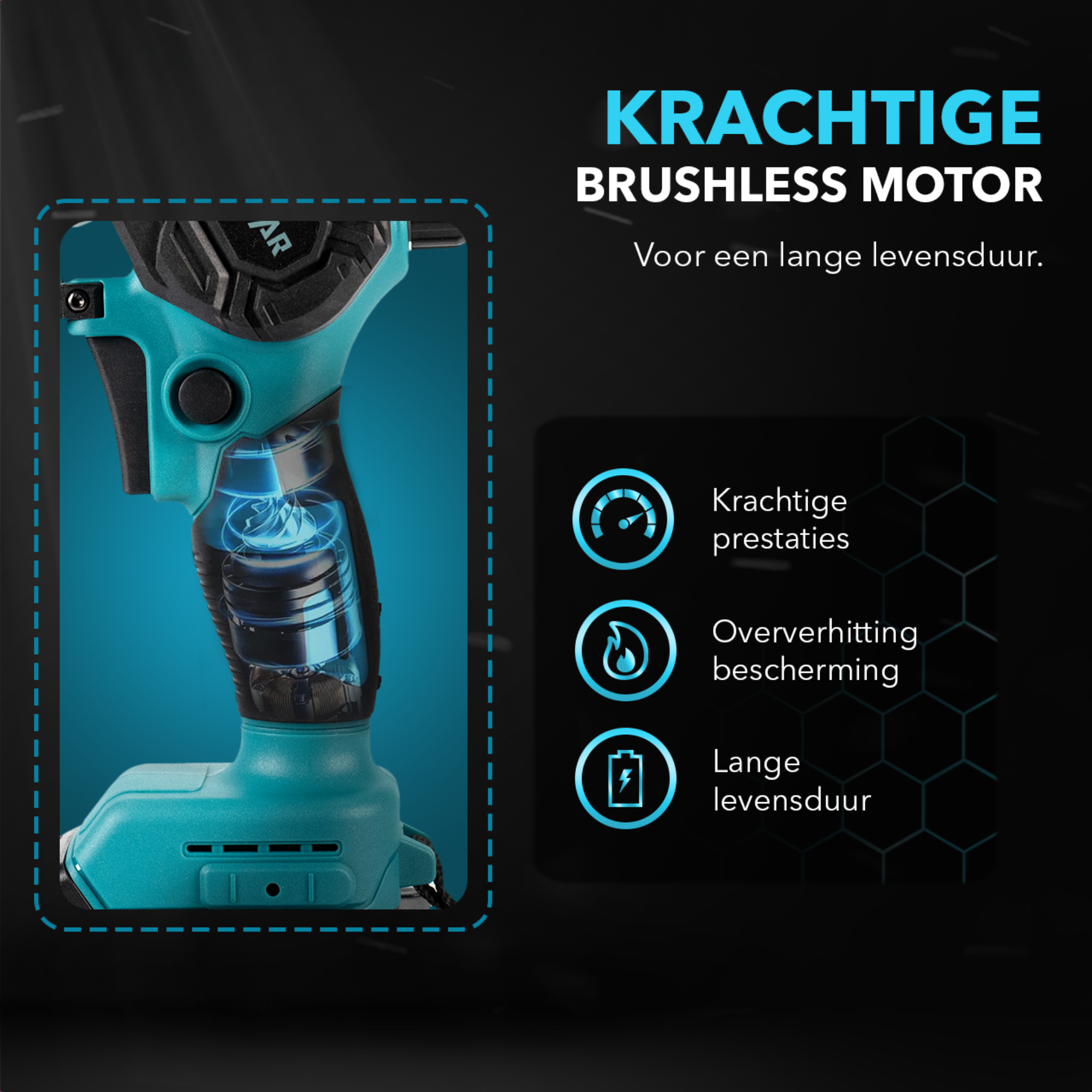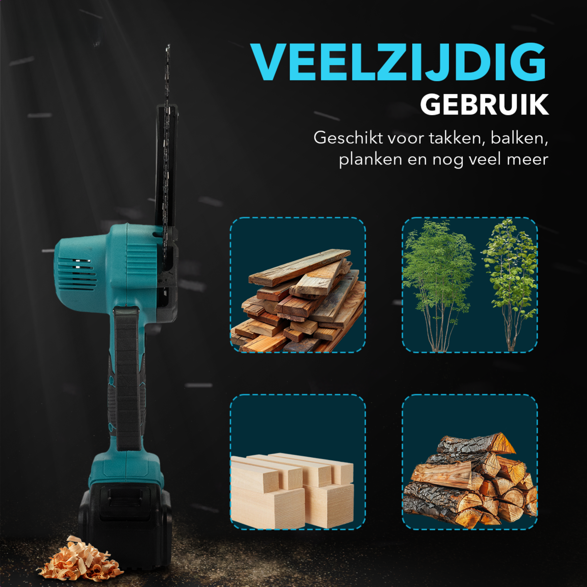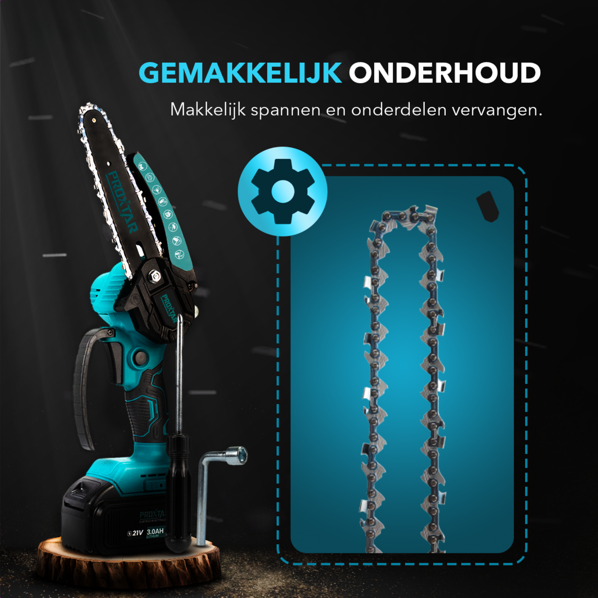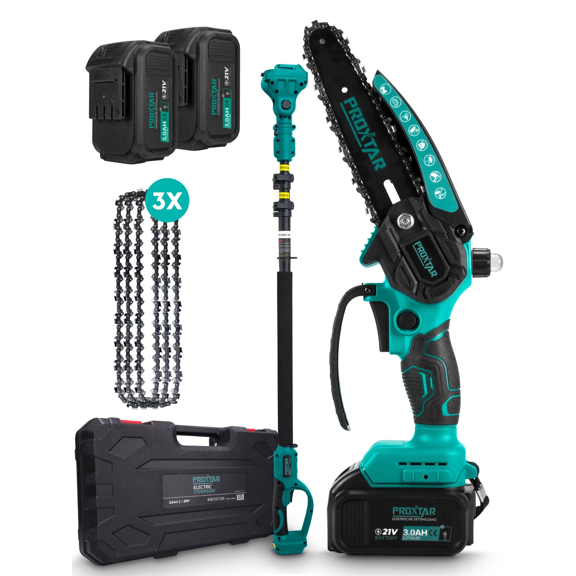 Werk draadloos en zonder concessies aan kracht met de ProXtar 6 inch mini kettingzaag met verlengstok. Dankzij de krachtige 3000 mAh accu’s werk je moeiteloos aan al je snoei- en zaagklussen, van dikke takken tot precisiewerk. Het compacte formaat en het lichte gewicht zorgen voor optimale controle en wendbaarheid – ideaal voor langdurig gebruik zonder vermoeidheid.