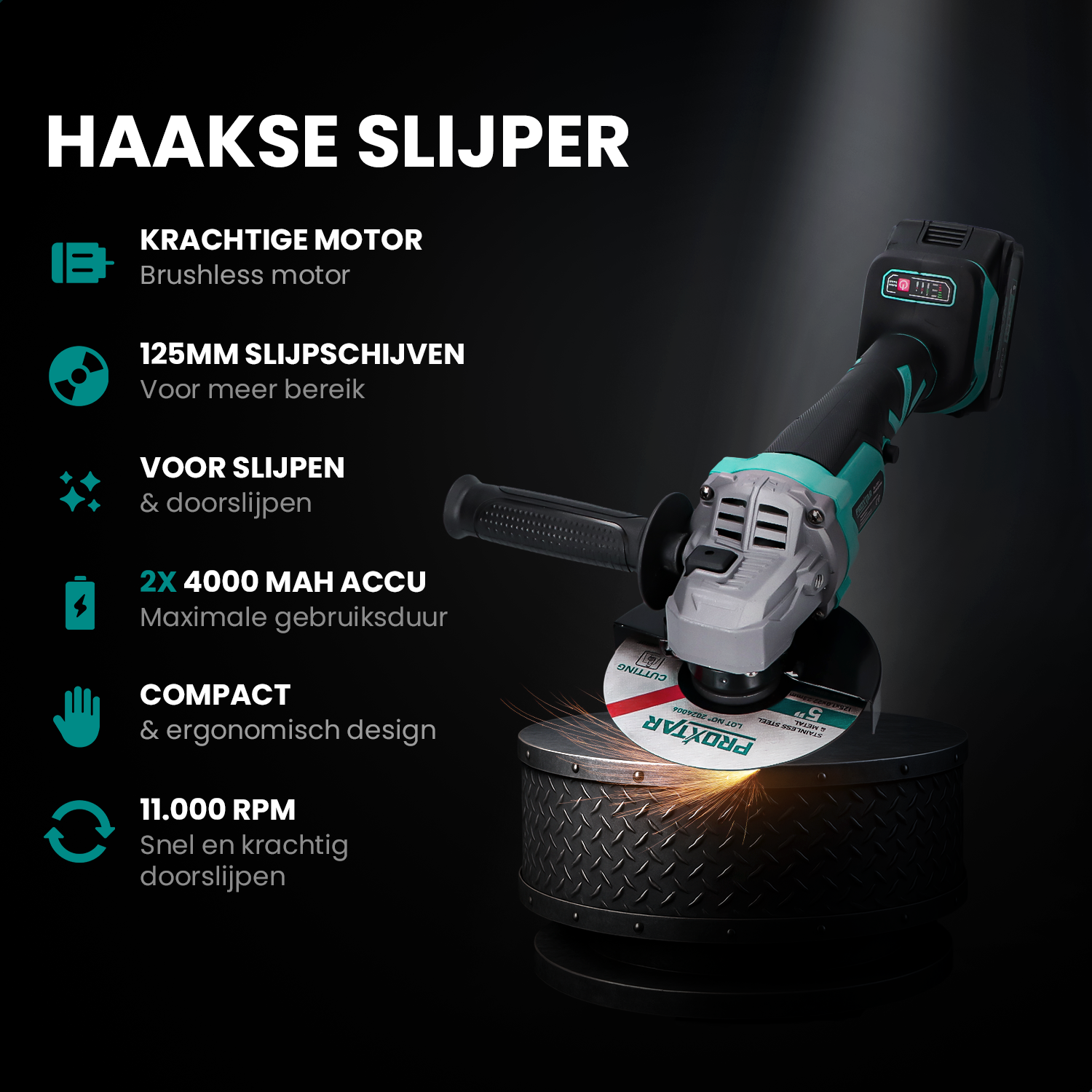 De ProXtar Haakse Slijper is een krachtige en complete alleskunner voor elke klusser. Met een 900W brushless motor, 11.000 RPM en twee 21V 4000mAh accu’s levert hij moeiteloos kracht, snelheid en uithoudingsvermogen. Dankzij het lichte ontwerp van 1,3 kg, soft-grip handgreep en verstelbaar zijhandvat werk je altijd comfortabel en nauwkeurig. Inclusief 8 hoogwaardige slijpschijven (6× doorslijpen, 2× afbramen) zodat je direct aan de slag kunt met metaalbewerking, doorslijpen, afwerken en professioneel montagewerk. Hiermee heb je alles in huis om elke taak snel, strak en gecontroleerd uit te voeren.