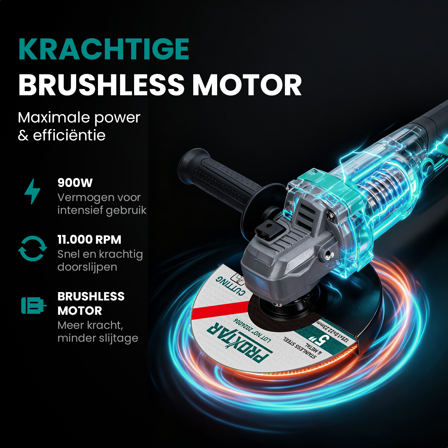 Dankzij de 900W brushless motor en een toerental van 11.000 RPM levert de ProXtar Haakse Slijper indrukwekkende prestaties bij elke klus. Of je nu metaal doorslijpt, bramen verwijdert of nauwkeurig afwerkt: de machine werkt soepel, efficiënt en zonder vermogensverlies. De borstel loze motor zorgt bovendien voor een langere levensduur en minimale slijtage, zodat je langdurig kunt vertrouwen op absolute kracht en stabiliteit.