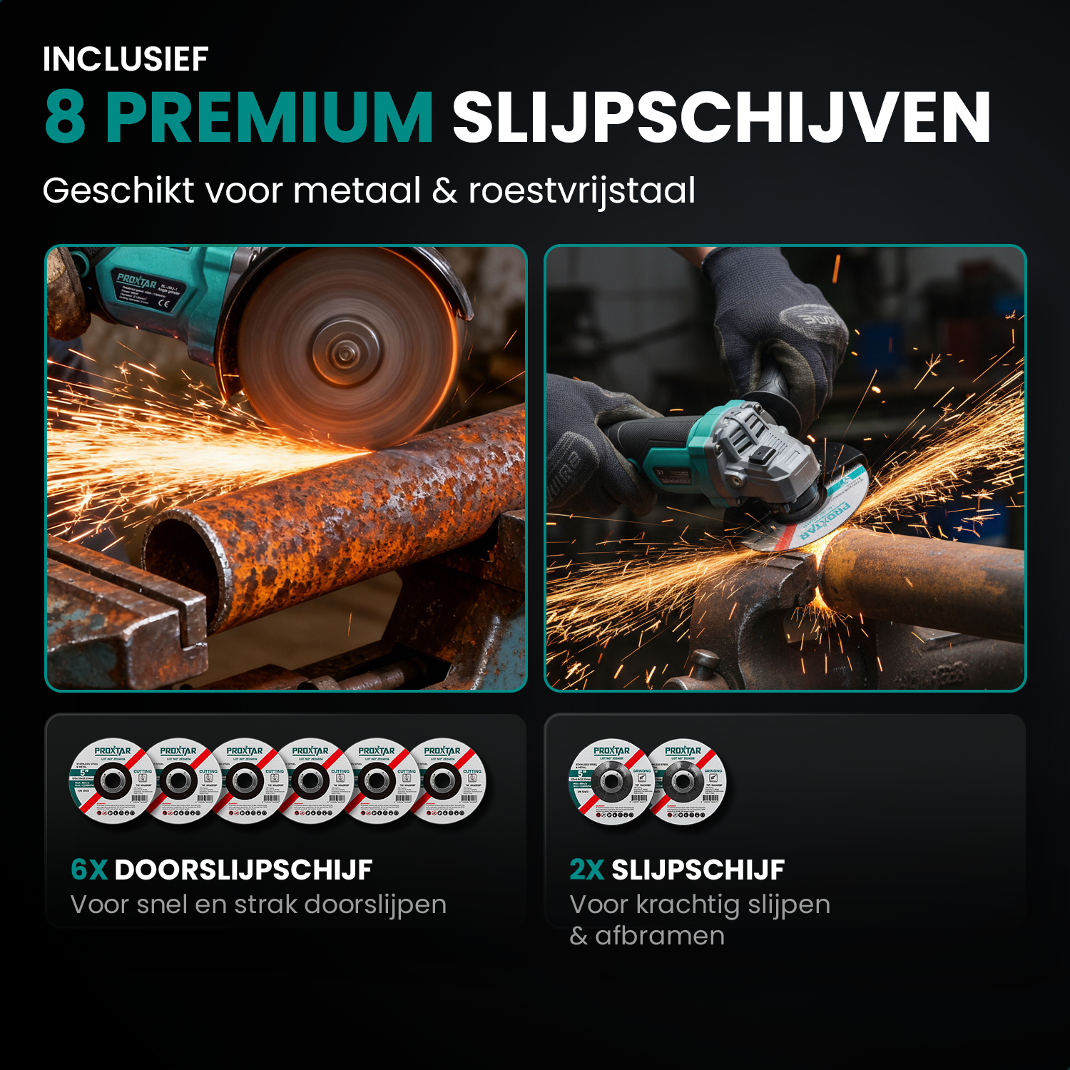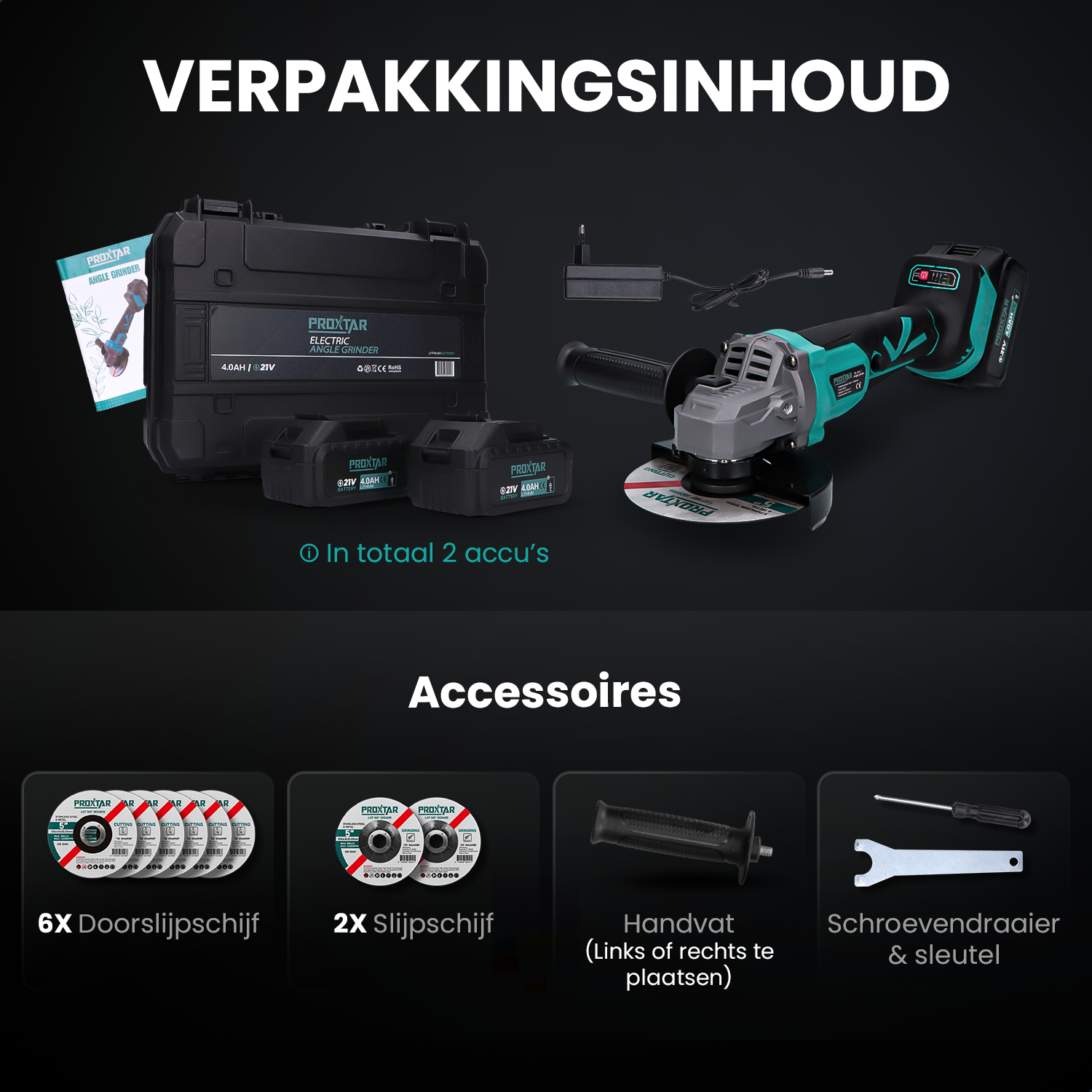 Inclusief 8 hoogwaardige slijpschijven en twee 4000mAh accu’s