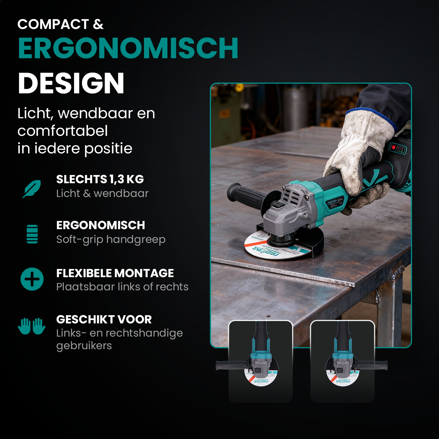 Zeker. De haakse slijper is ontworpen voor zowel links- als rechtshandigen. Het zijhandvat is aan beide kanten te bevestigen voor maximale controle.